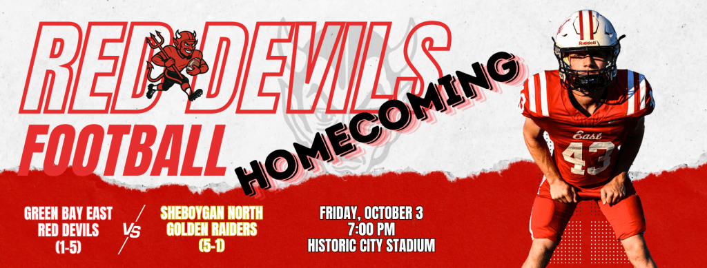 This Friday, our Green Bay East Red Devils return to historic City Stadium to host the 5–1 Sheboygan North Golden Raiders in a conference matchup. Kickoff is set for 7:00 PM on October 3, and it’s not just any game—it’s Homecoming AND Senior Night at East!